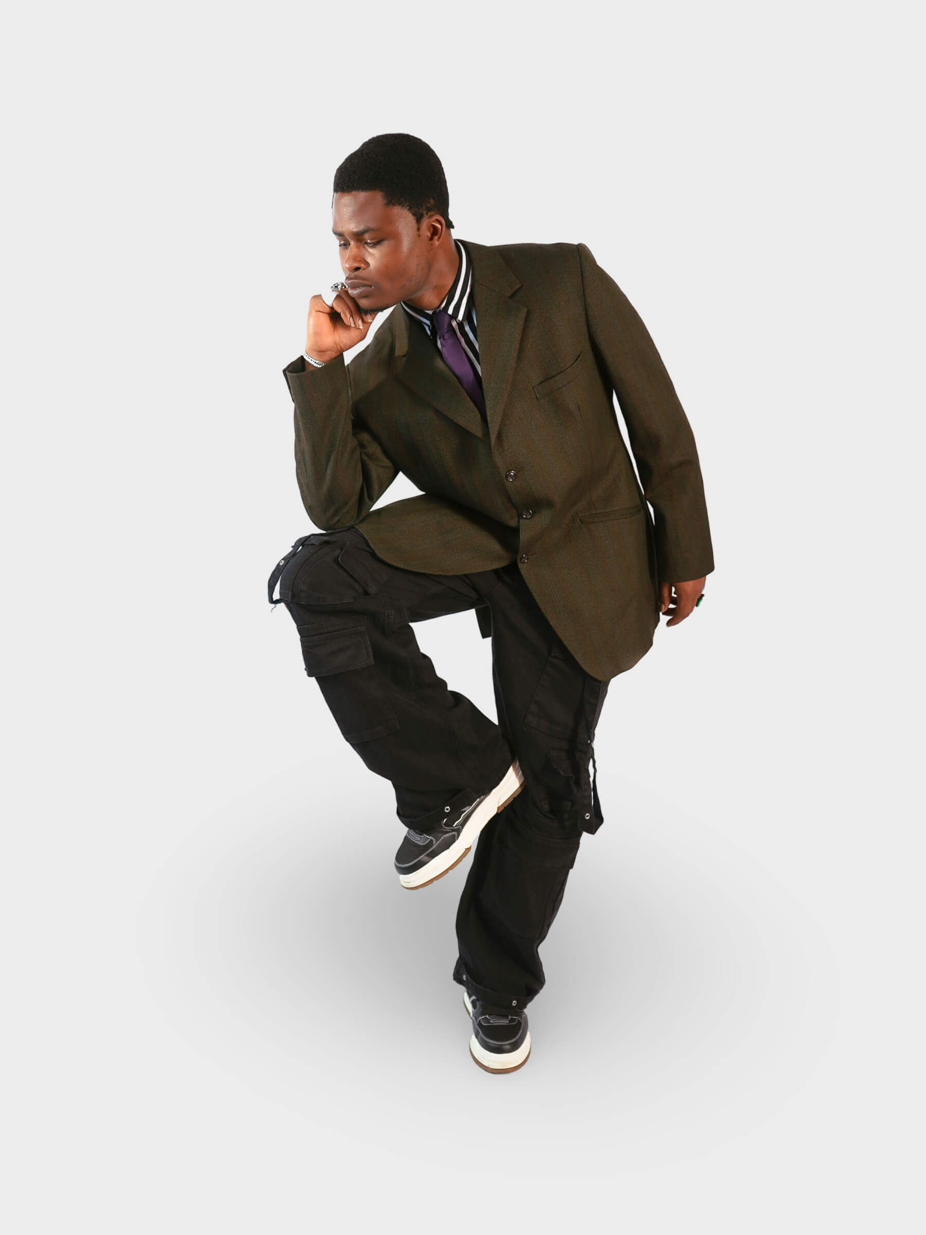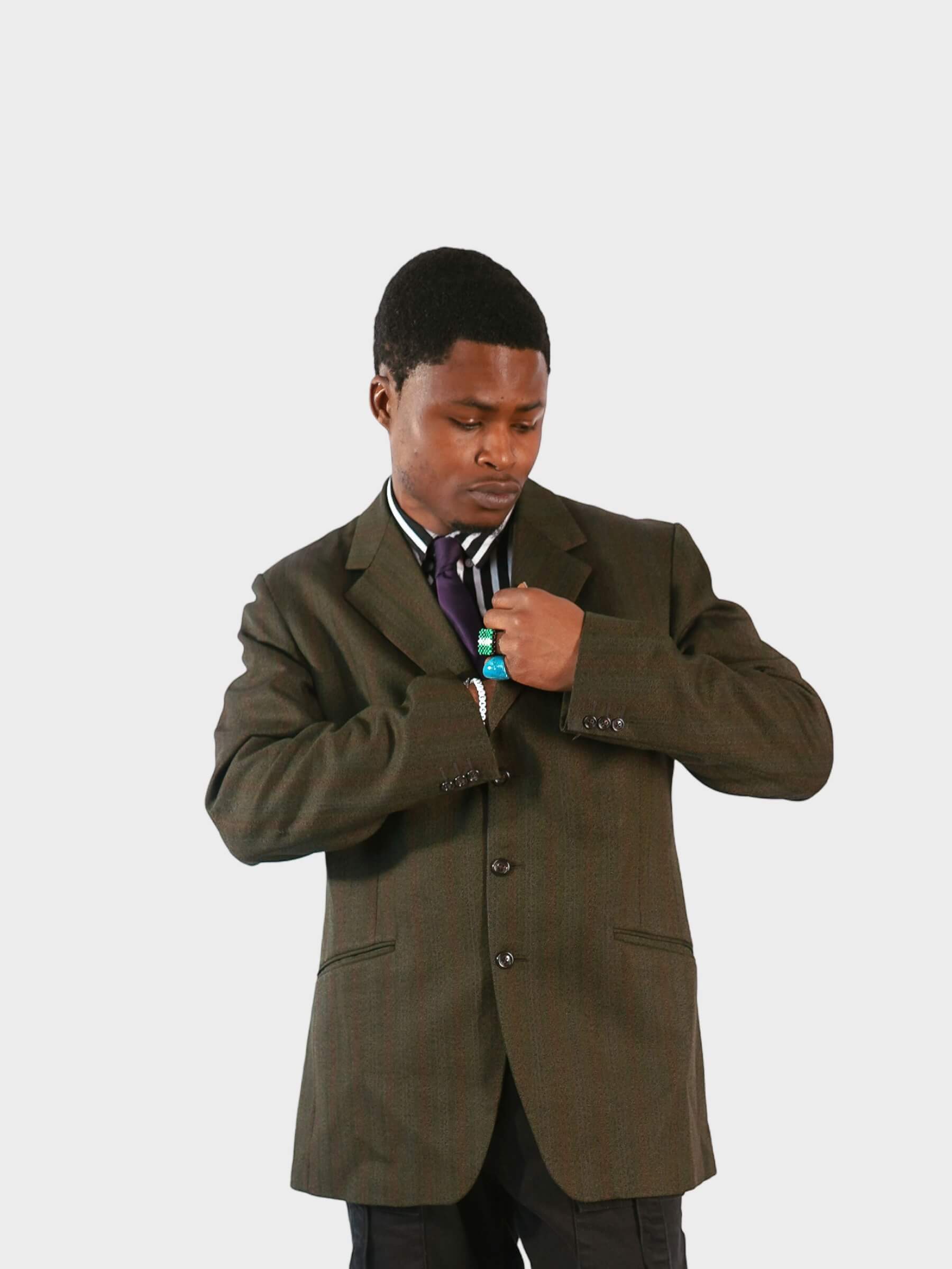Three-button front closure. Lapel-collar. Buttoned cuffs. Opening in the central part of the hem.