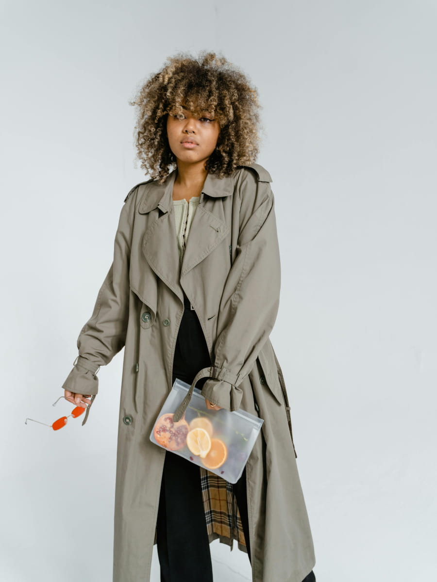 Straight Design. Wrap detail. Medium design. Lapel-collar. Long sleeve. Loops on the cuffs. Two side pockets. Button Fastening at the Front. Adjustable belt.
